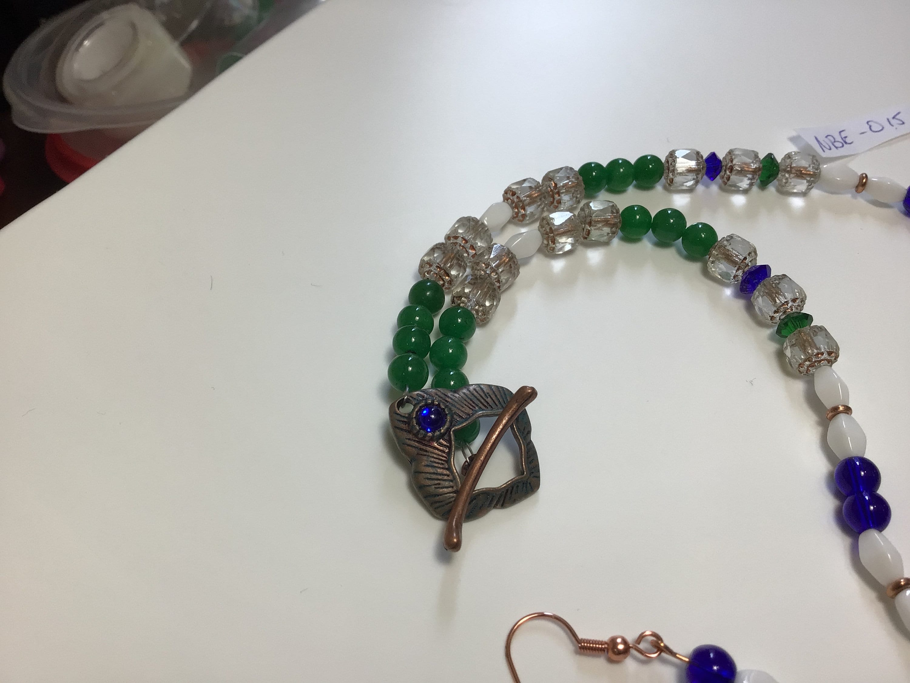 Multicolored three piece set. Showcasing rose gold/copper on cathedral Czech glass beads strung among green Malaysia “jade” (quartz), bark blue druk, and solid white double cone beads.