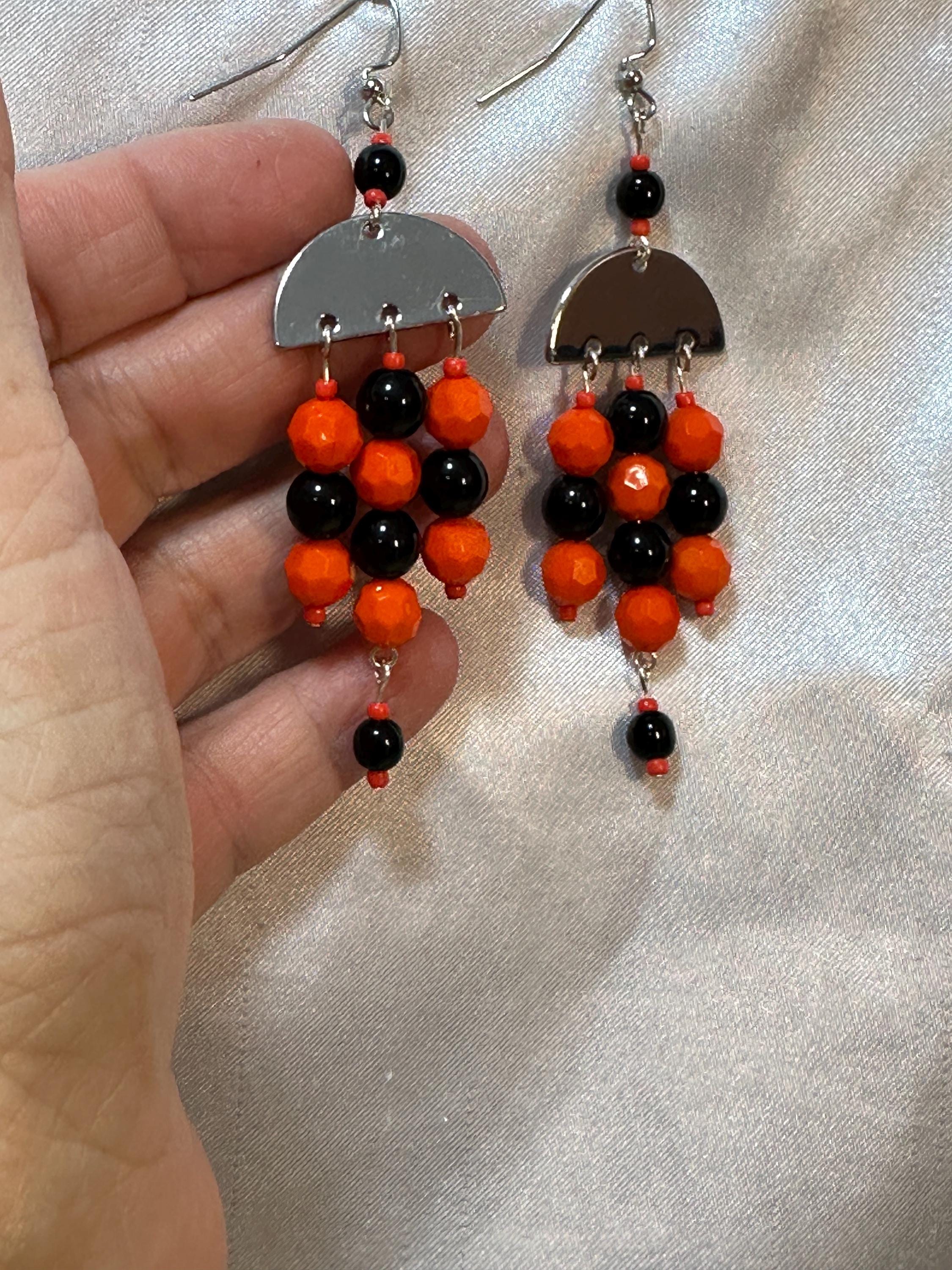 Chandelier style earrings. Spirit and Sports - your team colors - Black and Orange (Go Bengals). What ever your sport, school or event - if black and orange are you colors (Halloween maybe?) these are for you. Black glass 8mm round beads and faceted acrylic orange round beads 8mm hange from a 1/2 circle/moon silver connector creating that chandelier style. Embelished ear wires in silver show off these colors dangling approximately 3 1/4 inches.